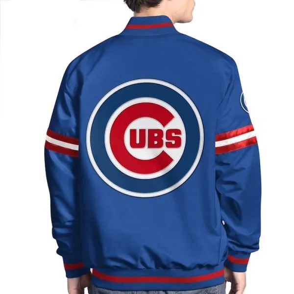 Show off your team pride with the Chicago Cubs Scout Varsity Satin Jacket in royal blue and white. Crafted from premium satin and lined with soft viscose, it features bold embroidered logos, contrast sleeve stripes, and rib-knit details throughout. Finished with a full-snap front.