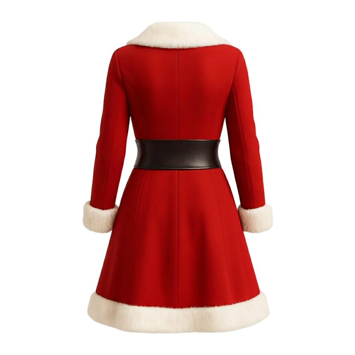 The vibrant crimson fabric of this enchanting coat dress instantly evokes festive cheer, beautifully complemented by plush white faux fur trim. Designed to captivate, this holiday essential features a flattering A-line silhouette that gracefully flares, creating a charming and sophisticated profile. A standout black corset-style belt cinches the waist, offering an adjustable and alluring detail that enhances your figure and adds a touch of playful elegance. Perfect for holiday gatherings, Christmas parties, or creating memorable festive moments, this coat dress combines classic seasonal aesthetics with modern flair. Its luxurious faux fur accents on the collar, cuffs, and hem provide warmth and an undeniably festive look, making it an ideal choice for celebrating the most wonderful time of the year. Embrace the spirit of the season with an outfit that is both comfortable and exquisitely stylish.