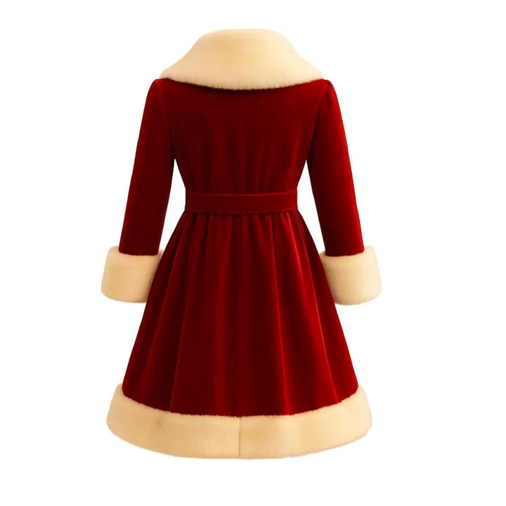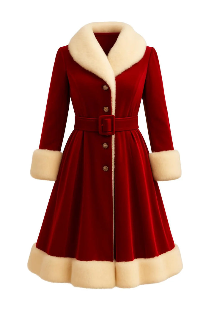 The plush, rich red velvet of this elegant coat instantly evokes the warmth and luxury of the holiday season. Adorned with a generously sized faux fur collar that cascades gracefully to meet the front opening, this coat is a celebration of festive style. Its tailored silhouette is beautifully cinched by a matching velvet belt, highlighting the waist before flaring gently into a knee-length A-line skirt. Golden-hued buttons provide a classic touch against the deep crimson, while plush faux fur cuffs and a coordinating hemline trim complete the opulent design. Perfect for Christmas gatherings, winter galas, or simply making a grand entrance, this coat wraps you in sophisticated charm, ensuring you radiate holiday cheer and timeless elegance wherever you go.
