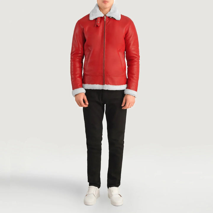 Embrace the festive spirit and conquer the cold with our Men's Festive Red Shearling Leather Aviator Bomber Jacket. This luxurious jacket is the ultimate statement piece for the winter season, making it an exceptional Christmas gift for him. Crafted from premium genuine leather, its vibrant red hue instantly adds a pop of holiday cheer to any outfit, while the plush white shearling lining provides unparalleled warmth and comfort. Designed with the iconic aviator silhouette, it features a wide shearling collar, sturdy front zipper closure, and adjustable buckle straps at the hem for a custom fit. Perfect for holiday gatherings, winter adventures, or simply elevating your everyday style, this jacket is a blend of timeless elegance and contemporary flair. Give the gift of warmth, style, and luxury this Christmas with a jacket that's built to impress and endure.