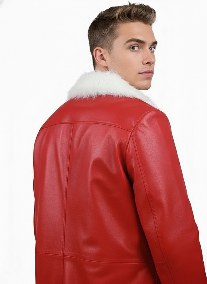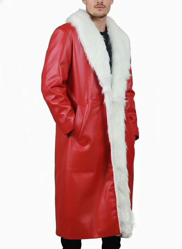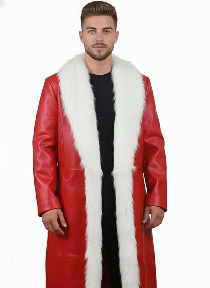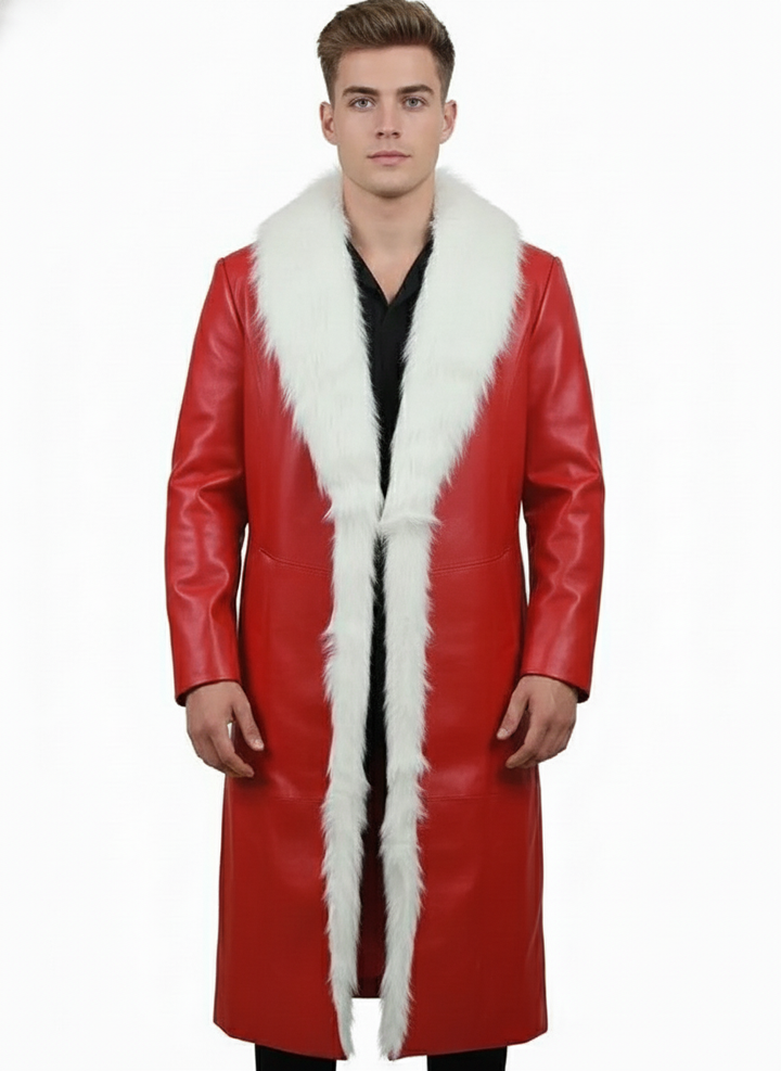 Embrace the spirit of the season with our Men's Luxury Red Leather Santa Coat. This exquisite long jacket is meticulously crafted to bring a touch of festive elegance to your holiday celebrations. Made from premium red leather, it features a lavish white faux fur trim that runs along the collar and down the front, exuding a classic Santa Claus charm with a sophisticated twist. Perfect for Christmas parties, holiday gatherings, or even a unique winter fashion statement, this coat ensures you'll stand out in style. Its comfortable fit and durable construction make it an ideal gift for the man who loves to celebrate in grand fashion. Get ready to spread holiday cheer and make unforgettable memories this Christmas season.
