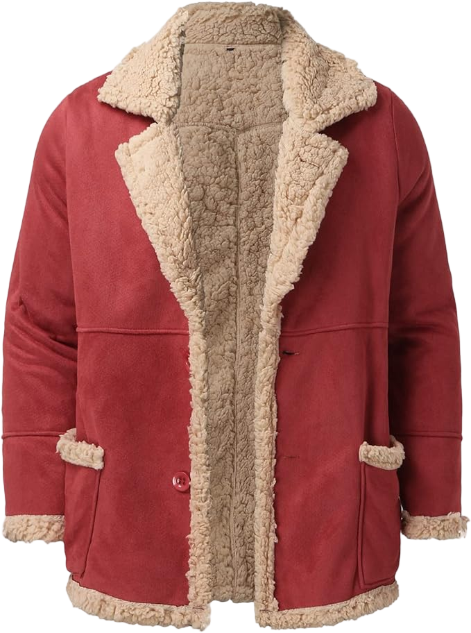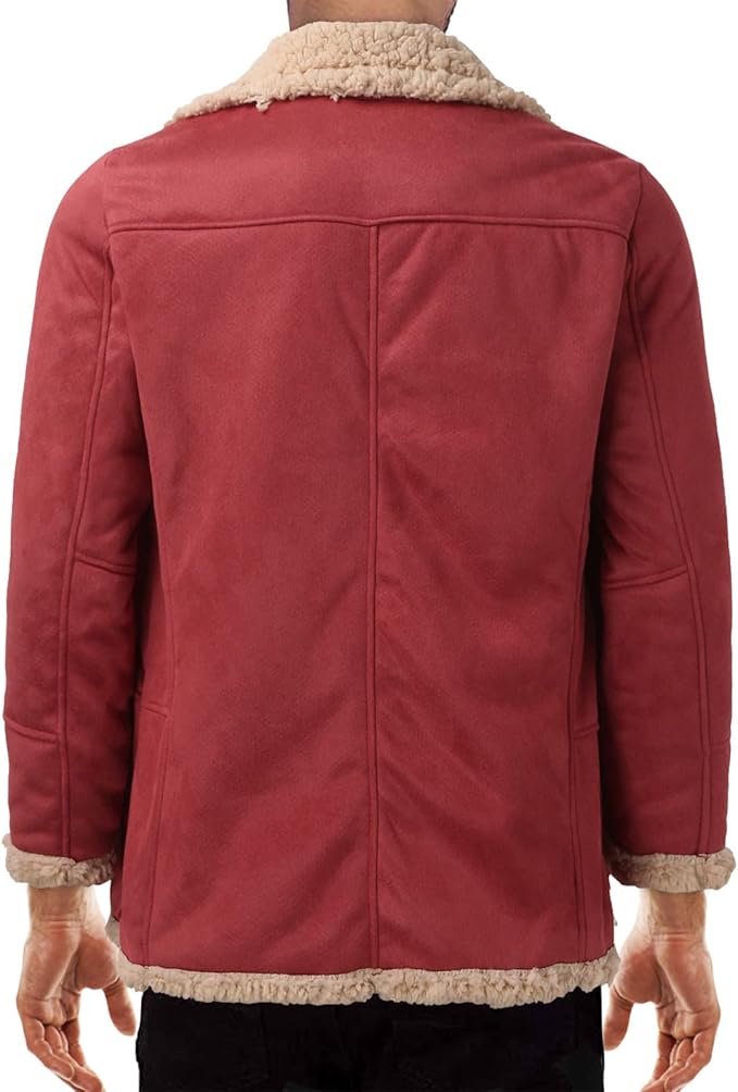 Embrace the festive spirit and conquer winter's chill in unparalleled style with our Men's Red Faux Shearling Suede Jacket. This luxurious coat is designed to keep you exceptionally warm and stylish throughout the holiday season and beyond. Crafted with a premium faux suede exterior in a rich, festive red, it exudes sophisticated charm. The interior is sumptuously lined with ultra-soft faux sherpa, extending to the collar, cuffs, and hem, providing ultimate comfort and insulation against the cold. Perfect for holiday gatherings, Christmas parties, or simply staying cozy on a chilly winter's day, this jacket makes an ideal Christmas gift for him. Its classic aviator-inspired design, complete with a button-front closure and functional pockets, blends timeless fashion with modern warmth. Gift the joy of warmth and style this Christmas!