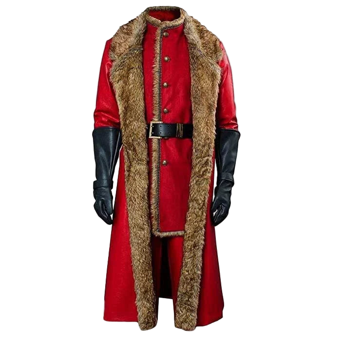 The striking red leather, complemented by plush brown faux fur, defines this extraordinary long coat. Designed to make a powerful statement, this dramatic outerwear piece features a high, stand-up collar and a luxurious faux fur trim that runs elegantly down the front opening, exuding a bold, festive charm. A distinctive black belt cinches the waist, creating a tailored silhouette that merges classic appeal with a modern edge. Perfect for those seeking to embody a sophisticated, contemporary Santa Claus, make a grand entrance at a holiday party, or elevate their cosplay ensemble with unparalleled flair. The coat's rich texture and vibrant color ensure you command attention, making it an ideal choice for Christmas celebrations or unique winter fashion statements.