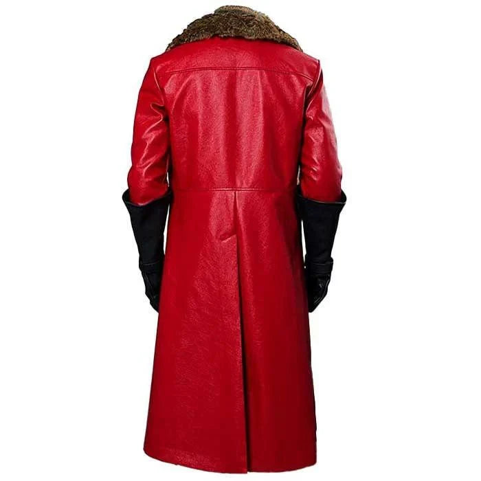 Men's Red Leather & Fur Trim Long Coat - Festive Christmas & Cosplay Outerwear