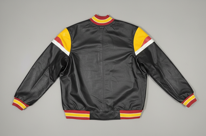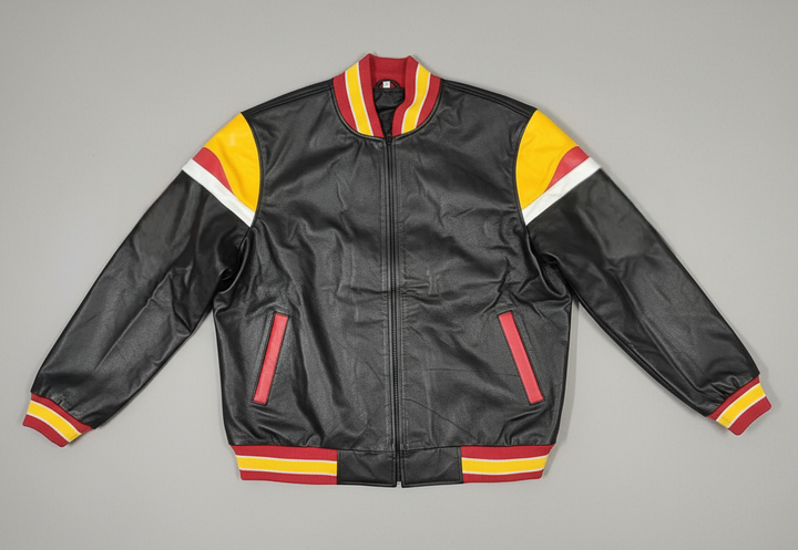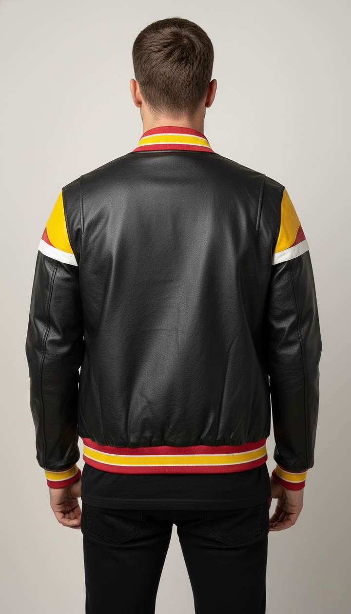 Crafted from premium, supple black leather, this bomber jacket offers both durability and a luxurious feel. The striking yellow, red, and white striped detailing on the sleeves, collar, and ribbed cuffs and hem instantly evokes a vintage racing vibe, ensuring you stand out from the crowd. Whether you're cruising on your bike or hitting the streets, this jacket promises to elevate your look with an undeniable cool factor.