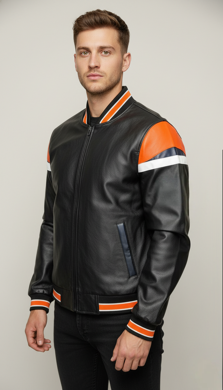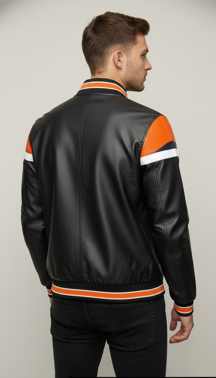Crafted from premium black leather, this jacket offers a sleek look and exceptional durability. It features prominent orange and white striped accents across the shoulders and sleeves, providing a dynamic and sporty edge. The ribbed collar, cuffs, and hem are also detailed with complementary orange and white stripes, creating a cohesive and eye-catching design. A subtle touch of navy blue is integrated into the sleeve stripes and discreetly on the sides, adding depth to the color palette. Whether you're navigating city streets or heading to a casual gathering, this jacket ensures you make a distinct style statement.