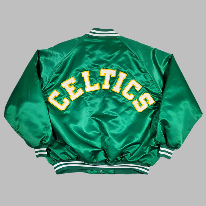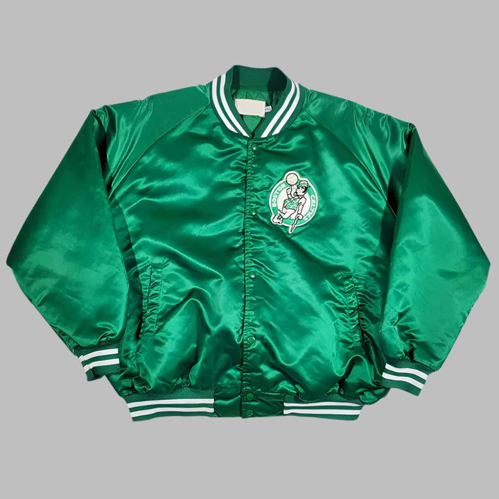 Boston Celtics Green and White Satin Varsity Jacket – NBA Full-Snap Style