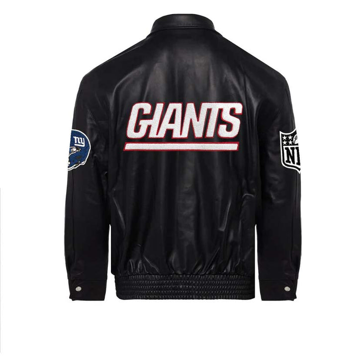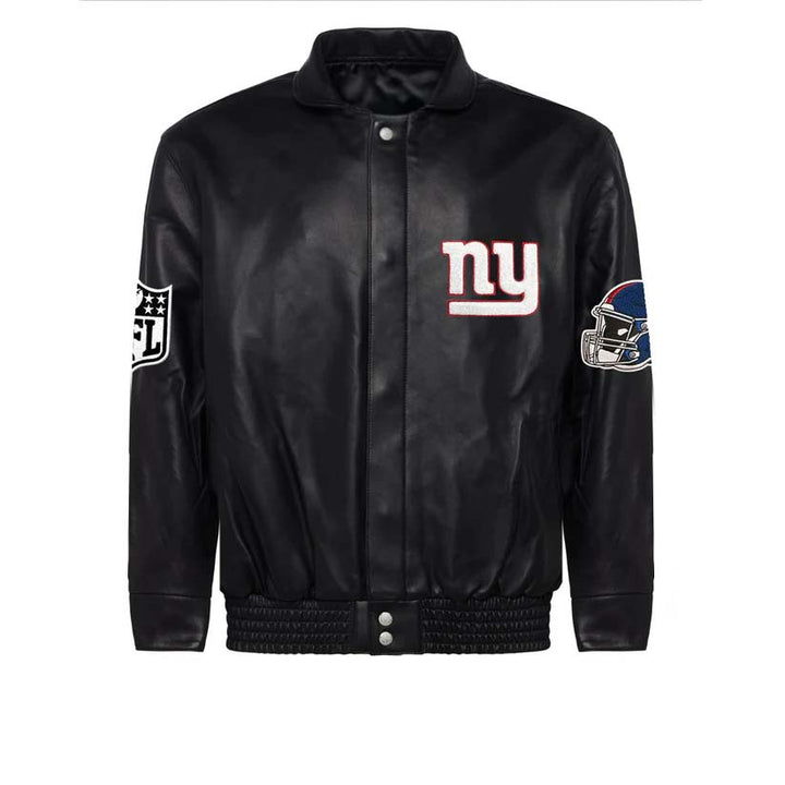Experience unbeatable style and comfort with our NEW YORK GIANTS full leather jacket in black. This expertly crafted jacket features the iconic emblem on the front, showcasing your team pride. Made with high-quality leather, this jacket will keep you warm and stylish all season long.