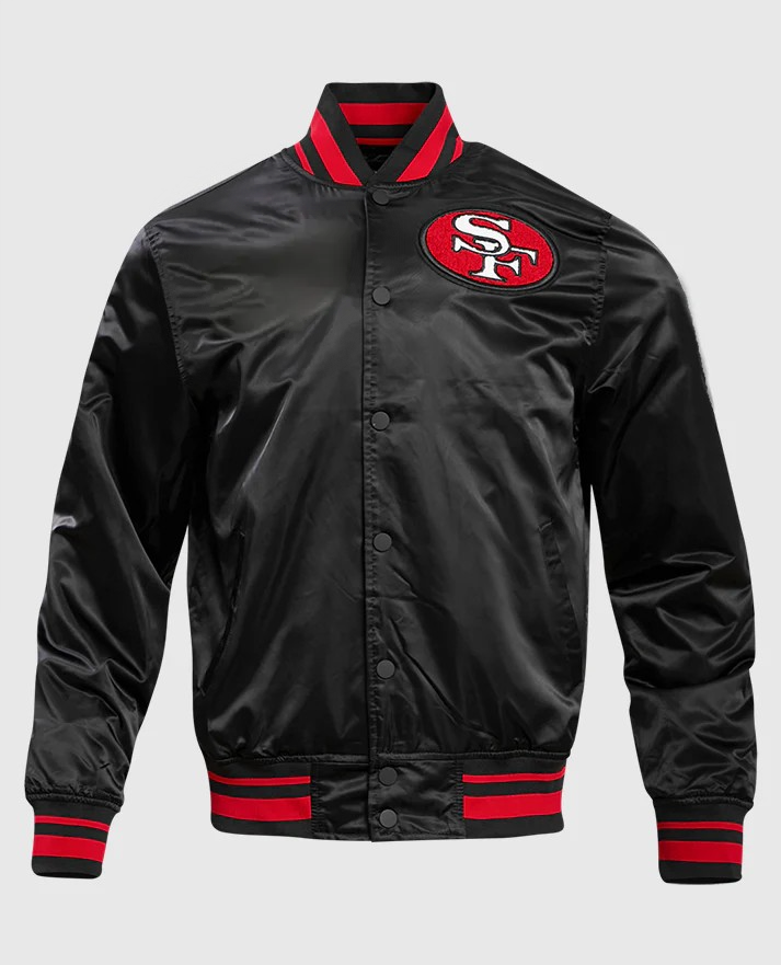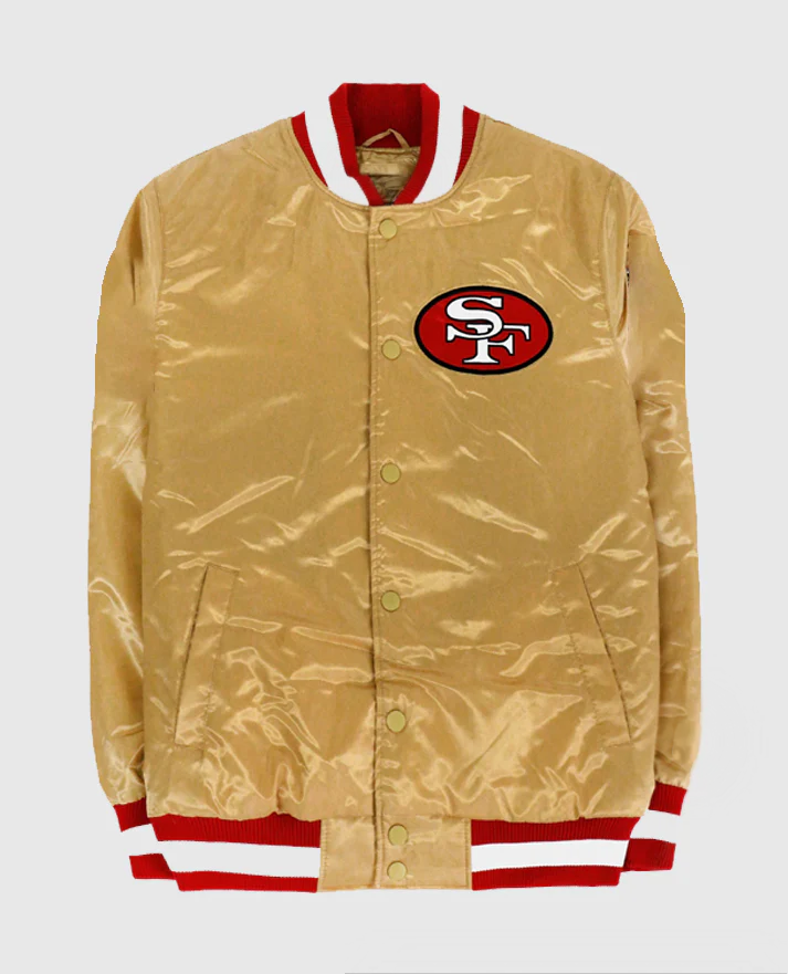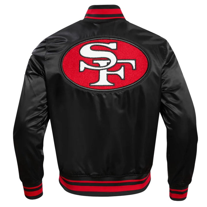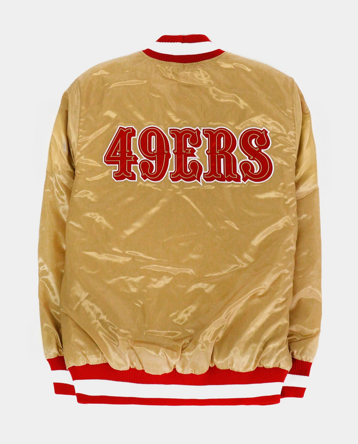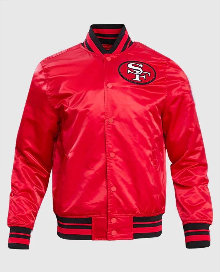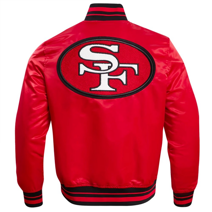Show off your 49ers pride in style! This San Francisco 49ers Bomber Satin Jacket features a glossy satin finish, bold team colors, and a cozy viscose lining for comfort. The rib-knit collar, cuffs, and waistline add a sporty touch, while the San Francisco logo on the chest makes a bold statement.