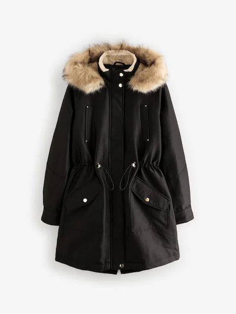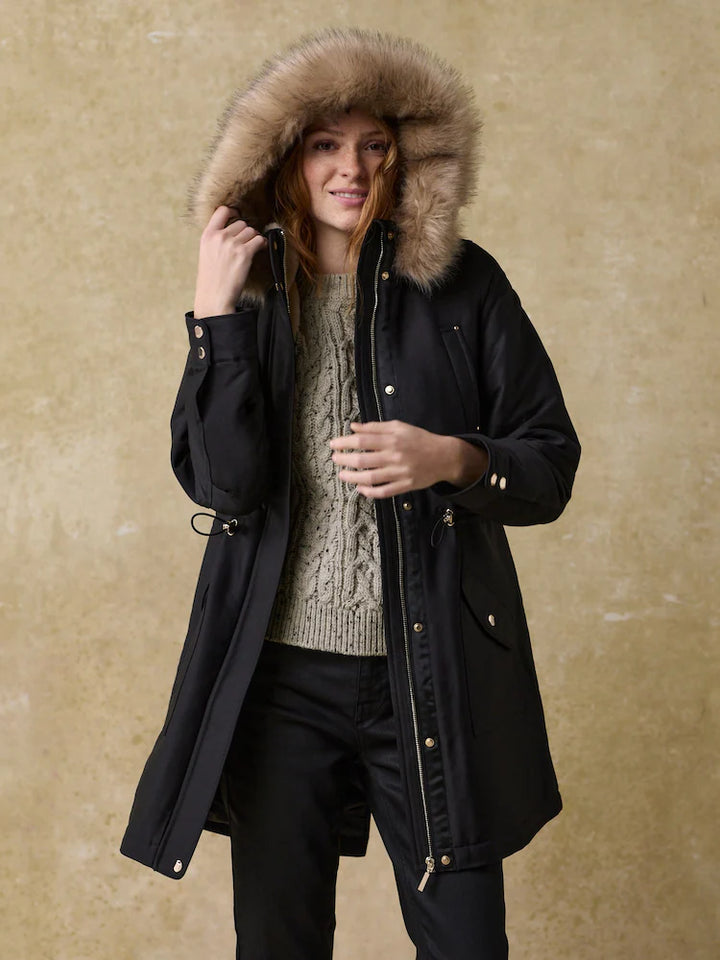 A cozy hooded parka designed to keep you warm and stylish through chilly days. Features a soft fur-trimmed hood that adds a touch of elegance. Tailored for a flattering, slightly structured fit with practical pockets. Perfect for layering over both casual and dressier winter outfits.