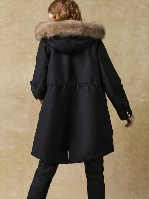 Black Hooded Parka Coat With Faux Fur Trim