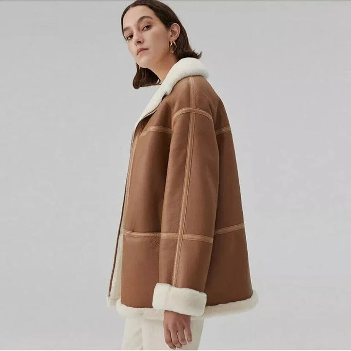 Premium Women's Genuine Sheepskin Brown Aviator Shearling Jacket