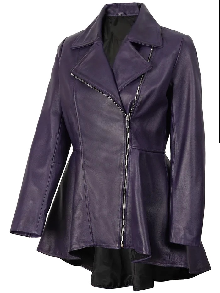 Exude confidence and elegance with the Women’s Asymmetrical Purple Peplum Leather Jacket. Crafted from 100% genuine lambskin leather, this modern jacket features an asymmetrical zip closure and a tailored peplum waist, offering a contemporary edge while enhancing your feminine silhouette. Perfect for adding a touch of glamour to any outfit.